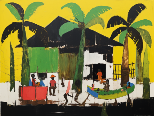 Create an abstract, vibrant composition inspired by a banana plantation. The design should feature stylized banana trees, large leaves, and clusters of bananas, arranged in flowing, organic shapes that blend together to form a dynamic, modern artwork. Use bold, sweeping lines and exaggerated proportions, with vibrant greens for the leaves, bright yellows for the bananas, and splashes of tropical colors like deep blues and warm oranges. The abstract elements should evoke the lush, abundant nature of a plantation, with shapes and colors interacting playfully. Keep the background simple, allowing the bright colors and organic forms to stand out and dominate the composition.