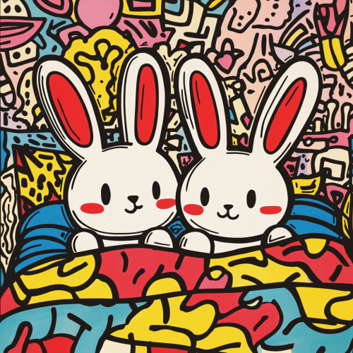 Two cute cartoon bunnies lying in bed, Keith Haring style graffiti, sharpie illustrations, bold black lines and solid colors, simple details, minimalism, sharpie illustrations --s 250