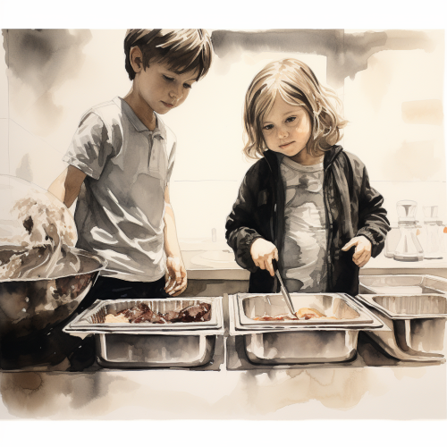 watercolor, abstruct image of a 3-year-old boy and a 8 year-old-girl in a hotel buffet, black white