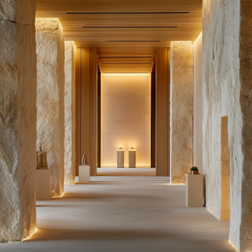A welcoming entrance designed with clean lines and natural materials like wood and stone. Soft, warm lighting gently illuminates the space. The entrance features minimalistic signage and small totems, setting a tranquil and inviting tone. Natural textures and a calming atmosphere emphasize the connection between nature and spirituality, preparing visitors for a transformative experience