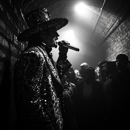 pearly king giving sermon to crowds in a london underground style techno club, 80's dark fantasy cinematic style, dark and moody lighting, cult, industrial