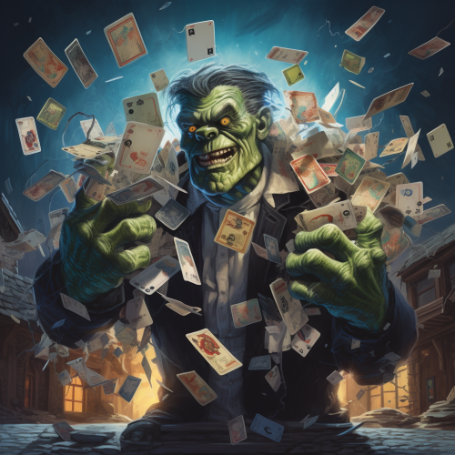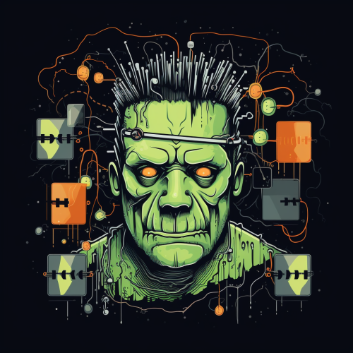 Frankenstein monster being assembled out of bank logos, credit cards and hidden fees, dark background, minimal colors, in the style of minimalist line art