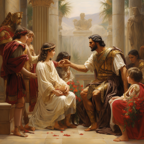 Create an evocative image that portrays Alexander the Great in a nurturing role, taking care of the Persian family of Darius III. Set the scene in a tranquil garden or oasis, with Alexander shown in a compassionate and protective stance. He should be tending to the needs of the Persian family members, such as offering food, shelter, or comfort. Show a sense of mutual respect and cultural exchange between the two parties, symbolizing the bridging of divides during a time of conquest and transition. The image should convey a message of benevolence, empathy, and the potential for unity between different cultures.