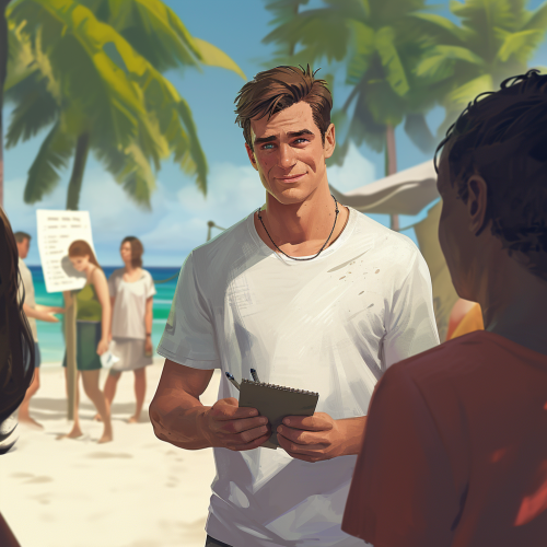21st century on a beach in Mauritius, a realistic scene of a man named Olivier conducting a survey campaign. Olivier, a charming 30-year-old man with brown hair and green eyes, is wearing a t-shirt clearly inscribed with his name. He is questioning a diverse group of people, all in search of happiness and well-being. The background features a picturesque beach landscape, with palm trees and turquoise ocean. The atmosphere is relaxed yet engaging, with Olivier holding a notebook and pen, asking questions to an attentive audience. The scene is lit by a soft sunset light, creating a warm and welcoming ambiance. The composition is cinematic with depth of field and framing that highlight the interaction between Olivier and the audience. Banners and posters of the Funnel Club are visible in the background, indicating the campaign's sponsor. The style is photorealistic, with natural and soft color grading. --v 6.0