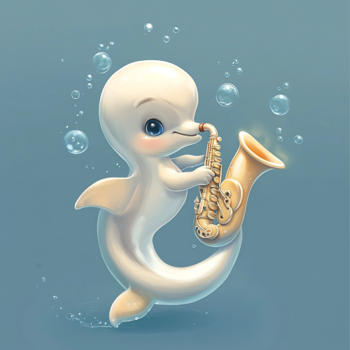 A playful baby dolphin is floating upright, playing a saxophone made of a conch shell, with bubbles floating out of the horn. The dolphin has a jazzy, carefree expression, as if it's really getting into the music. - Pixar animals style