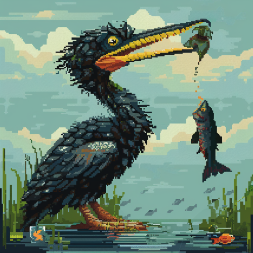 256 x 256 8 bit pixel art, cormorant catching a fish --v 6.0