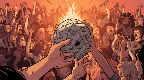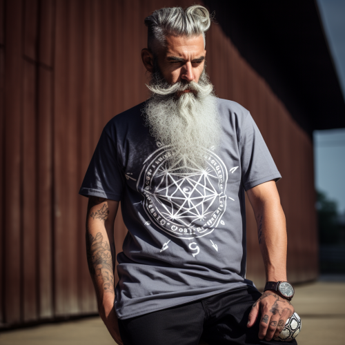 D20 sided dice with a long grey beard, 2D print, logo, T-shirt print