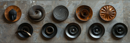 0, 1, 1, 2, 3, 5, 8, 13, 21. 34, 55. Japanese perfect Circles, Fibonacci sacred geometry. Buddha. Abstract. Wood, black and metal. --chaos 5 --ar 3:1 --stylize 250 --v 6.0