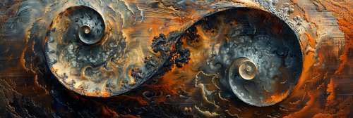 0, 1, 1, 2, 3, 5, 8, 13, 21. 34, 55. The tempest. Japanese perfect Clouds, Weird Moon. Fibonacci. Fractals. sacred geometry. Coriolis. Clouds. Abstract. Drop. Water ondulations. Fresco. Wood, black and metal fusion. high contrast. --ar 3:1 --stylize 250 --v 6.0