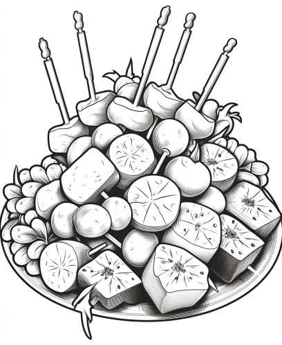 Kids Coloring Book easy and bold design of Cheese and fruit skewers,vector illustration, black and white no grey scale, clear lines no shadow dither gradient fill solid --ar 9:11
