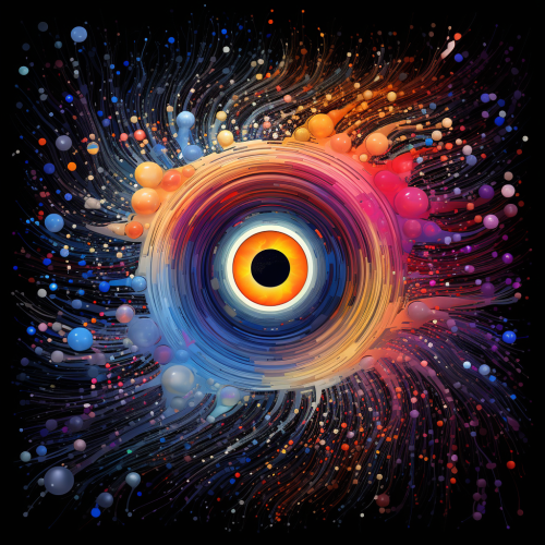 A mind-boggling universe, unimaginably intricate, emerges from spirals of ethereal glass, quantum particles exploding like fireworks, forming voxels across infinite dimensions. It's a minimalist representation of an AI quantum eye, composed of countless quantum dots. This ethereal mind exudes brilliance, with a symphony of quantum dots glowing in various states of superposition, entanglement, and coherence. Each dot symbolizes a quantum bit, pulsing with potential for computation and transcendence. This quantum masterpiece strikes a harmonious balance between simplicity and complexity. Adding a colorful star and splashes of blue and yellow light, it evokes organized chaos, scientific illustrations, a play of light in shades of black and red, a tumblewave of data visualization, spiraling groups, and colorful explosions. It's a futuristic AI mind, a fusion of art and quantum elements, with abstract shapes and ethereal glows that portray the intricate beauty of this quantum consciousness --v 5.2