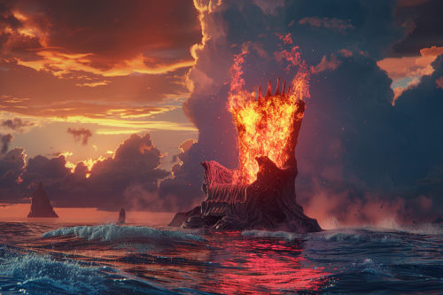 animated style, a huge throne made of fire placed on a vast ocean --ar 3:2