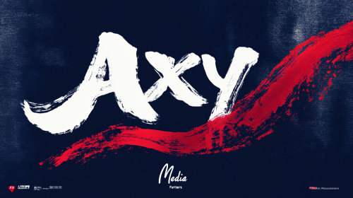 Modern Japanese-inspired logo of "Axy" in bold, large white calligraphic brushstroke, centered on a deep navy blue background. Below, "Media Partners" appears in a smaller, refined white brushstroke style. A single red brushstroke flows beneath, dynamically curving in a Shinnyou radical-like shape, suggesting elegance and strength --ar 16:9 --v 6.1