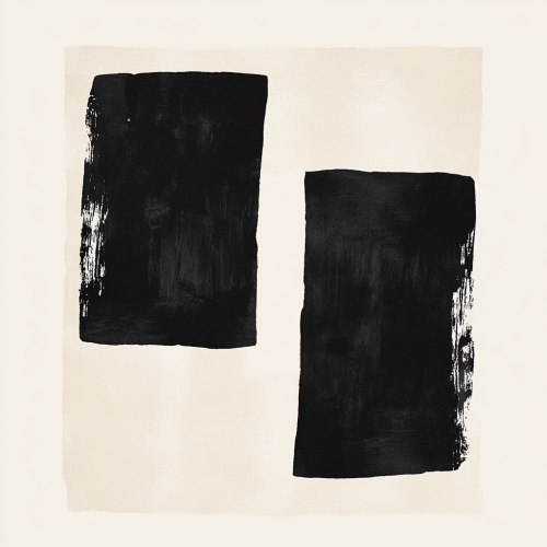 an art print features a bold, minimalist composition. It consists of two large, roughly rectangular black forms on a neutral background, separated by a vertical strip of white space. The black areas have irregular, slightly textured edges, which give them a hand-painted appearance, while the white space between them acts as a stark division. The simplicity of the shapes and the contrast between black and white create a powerful visual tension, invoking a sense of balance and opposition. The piece feels rooted in abstract expressionism or minimalism, focusing on form, contrast, and the interplay of positive and negative space.