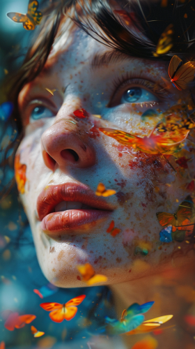a floral Metamorphosis Concept: "Floral Metamorphosis" is a symbolic and abstract representation of a woman's face transforming, blending elements of nature and surrealism. The artwork portrays the woman's inner beauty and strength, symbolized by the rooted tree hair while celebrating her multi-faceted identity with rainbow lips. Purple tulips, known for their symbolism of admiration and enchantment, frame her face, adding a touch of elegance and mystique. Composition: Face: The woman's face is rendered in an abstract, cubist-inspired style reminiscent of Picasso's work. The facial features are fragmented, creating an intriguing interplay of shapes and forms. The use of cool and soothing colors like blues and purples accentuates the surreal atmosphere. Purple Tulips: Surrounding the woman's face are vibrant purple tulips, their petals curving and twisting in a harmonious dance with the contours of her visage. These tulips symbolize the admiration and enchantment that the viewer experiences when gazing upon her. Rainbow Lips: The woman's lips are the focal point of the artwork. They are painted in a mesmerizing rainbow of colors, representing her diverse and multifaceted identity. The lips exude confidence and individuality, challenging conventional beauty standards. Rooted Tree Hair: Emerging from the top of her head, the woman's hair takes on the appearance of a rooted tree. The tree's branches and roots intertwine with her hair, symbolizing her strength, resilience, and connection to nature. The roots extend downward, grounding her in her identity and values. Interactivity: To enhance viewer engagement, the artwork can incorporate subtle, shifting LED lights that illuminate the tulips and the rainbow lips, creating a dynamic interplay of colors. As viewers [...]