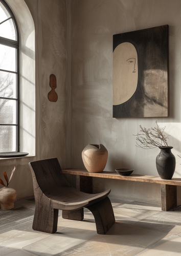 Create a minimalist abstract artwork that blends smooth, curved shapes with bold vertical lines. Use a neutral palette of beige, soft taupe, and off-white, accented with deep charcoal and gold details. Incorporate subtle textures and gradients to give depth and contrast to the composition, evoking a sense of quiet sophistication and modern elegance. The artwork should have a clean, architectural feel, with geometric forms suggesting movement and flow, making it an ideal addition to a contemporary, design-conscious space. --ar 2:3
