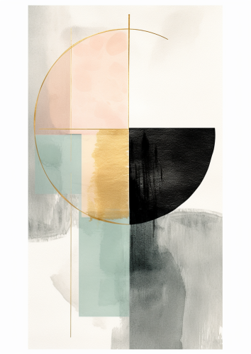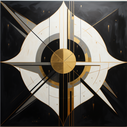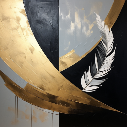elegant minimalist abstract geometric painting, black ,silver and gold colors, simple lines, sword and emblem.