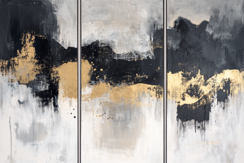 Abstract art painting, with a black and white color scheme and gold accents. The composition is a three-panel vertical triptych. The tones are neutral, and the work features brush strokes on a textured canvas. --ar 3:2