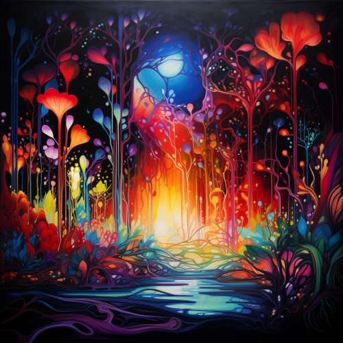leavse, hypermaximalism, abstract art painting glowing colours --ar 7:4