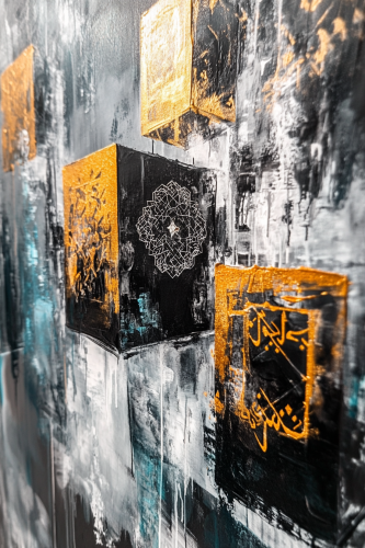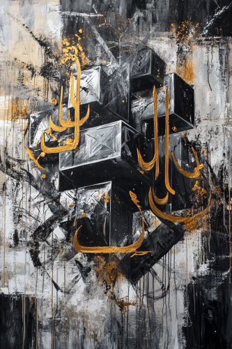 abstract painting inspired from ALKABA CUBE in Mekkah , Arabic theme , dynamic brushes , 16k , luxury theme , colors black grey silver gold --ar 2:3 --v 6.1