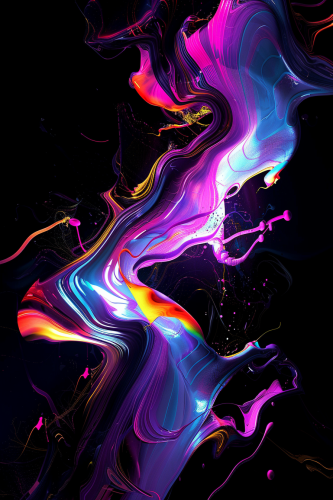 A bold graphic illustration on a black background, showcasing a vibrant splash of neon colors, dynamic shapes, and flowing lines. The colors contrast sharply against the dark background, creating a sense of movement and energy. Created Using: digital painting, neon glow effects, abstract expressionism, vibrant color palette, fluid dynamics, light diffusion, hd quality, vivid style --ar 2:3 --v 6.0
