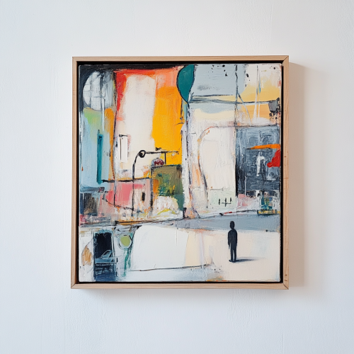 oil painting abstract, museum, a small picture on a white wall with a simple wood frame, inside the picture a big abstract city environment with a small man