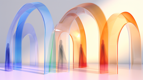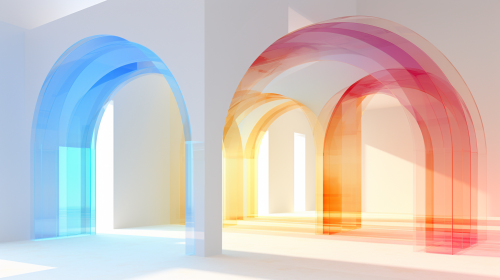 abstract vector image, parallel projection of 3 archways side by side, plexiglass translucent white material, colorful spectrum, james turrel sanaa steven holl, --ar 16:9