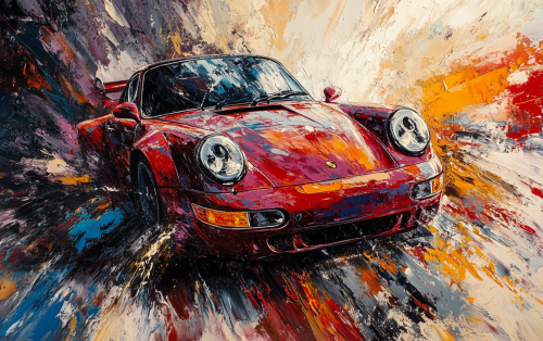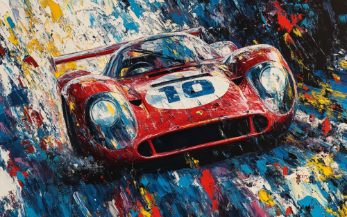 Award winning abstract painting found in famous gallery or museum, modern poster art, Porsche 917, high contrast, rich texture, rich color, HD, award winning, oil painting, abstract background, Leroy Nieman Style, Thomas Kincaid Style, --ar 8:5