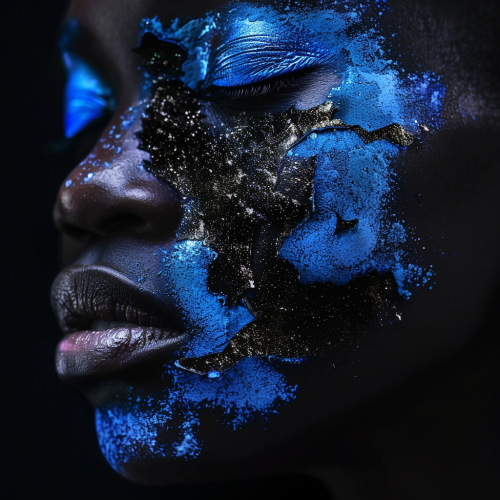 Abstract portrait on rough canvas, split vertically. Left half: serene Indian woman's face, right half: ferocious Kali. Vibrant blue skin throughout with thick, visible brushstrokes. Left side: calm expression, strong Indian features (prominent nose, full lips), closed eye. Right side: intense expression, wide open eye, protruding red tongue, disheveled black hair in chaotic strokes extending beyond canvas. Large, prominent red bindi at center, bridging both halves. Heavy impasto technique with visible paint scoops and smears. Background blends chaos and calm. Style merges abstract expressionism with traditional Indian art motifs. Exaggerated brushstrokes and palette knife textures. Colors blend at center line. Rough canvas texture visible. Dominant colors: varied blues, deep black, vibrant red accents. Non-idealized, raw representation of features. Harsh lighting to emphasize textures and contrasts. 8K resolution. --ar 3:4 --stylize 950 --chaos 40 --v 6.0