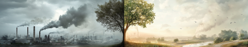 a realistic image split into two contrasting sides, with a complete, tall tree standing in the center. On the left side, depict a heavily industrialized scene with factories emitting thick fumes from chimneys. Show the tree's leaves actively absorbing the smoke and pollution. As the fumes pass through the tree, they transform into clean air, brightening the scene on the right side. This side should be a vibrant, luminous ecosystem full of wilderness, lush greenery, clear skies, and abundant wildlife, representing health and nature's resilience. --ar 16:3 --style raw