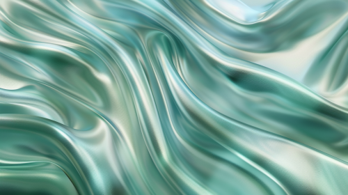 A high-resolution abstract wallpaper with wave-like silk textures in turquoise and silver, delicate folds with iridescent shine, soft blurred gradient background in pale greens. Lighting emphasizes the smooth and shiny fabric, creating a luxurious aesthetic. hd quality, artistic fabric, soft reflections, smooth lighting transitions, elegant design --ar 16:9 --v 6.0