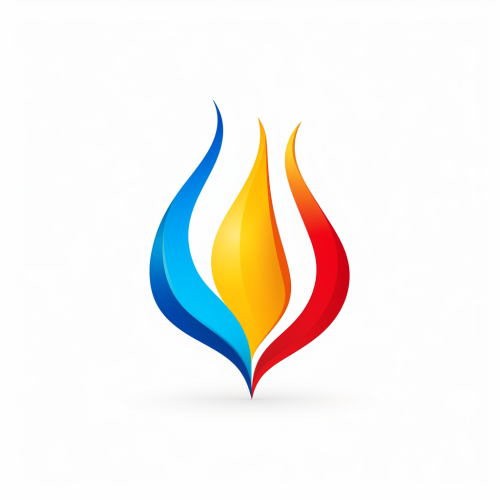 logo, abstract spade and abstract flame combined, red, yellow, blue, solid colors, simple shapes, white background, sleek, sophisticated, elegant, minimalistic