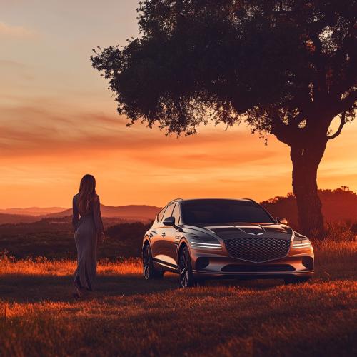 Silver Genesis Gv70 auto on an orange summer sunset with a slight rotation with an ethically ambiguous woman walking towards the car wearing luxurious clothes
