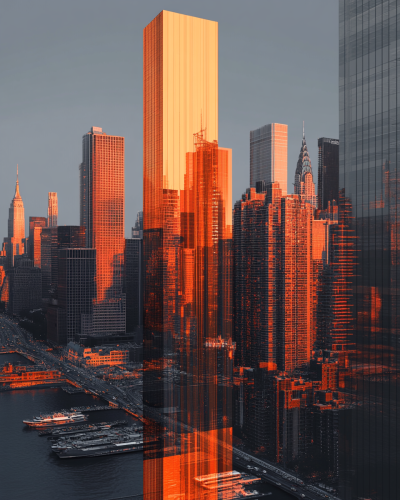 generate a photorealistic image of a portrait of new york city showing greenenergy solutions, or maximizing energy savings and profitability, utilized dark orange in theme --ar 4:5