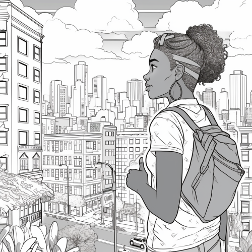 Illustrate a black and white coloring page that showcases a black woman in an urban setting, reflecting the diversity and energy of the city --v 5.0 --s 250