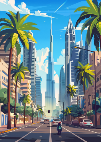 Dubai dowtown, flat illustration, sunny day, not too complex, modern, 4k, epic composition, flat vector art illustration, long shot --no text, fonts, letters, words, watermark --ar 5:7