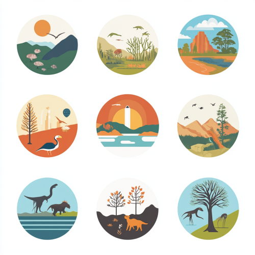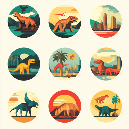 illustrative icons for the Natural History Museum of Los Angeles dinosaur hall. abstracted. simplified. in a circle, they have to be simple icons, like for an app. natural colors that evoke both prehistoric landscapes and the urban nature of Los Angeles. Consider themes like ancient creatures juxtaposed with modern life, or a fusion of wildlife with cityscapes to reflect the museum’s role in bridging past and present. Incorporate elements of native flora, fauna, and the vibrant culture of Los Angeles, keeping your illustrations dynamic and full of energy.