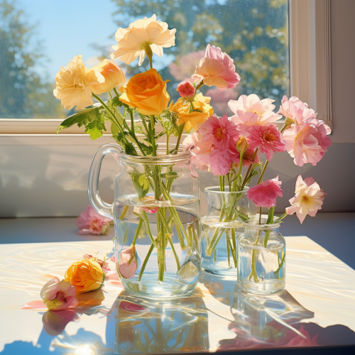 ultra realistic still life of multiple water vaces with colorful flowers with sunlight in the background