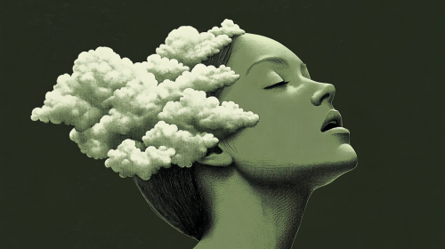 Surrealistic style, a woman's head is cut in half, with white clouds floating on the face and neck, obscuring her eyes and mouth, with simple shapes and lines, black and green, the face is made up only of layered organic planes that appear to be floating above it, giving an illusionistic effect --ar 16:9 --sref 242793564 --sw 500 --stylize 1000