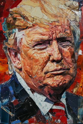 abstract modern fauvism, collage style, Victorious Donald Trump, red and white stripes, blue stars, torn paper, --v 6.0 --ar 2:3