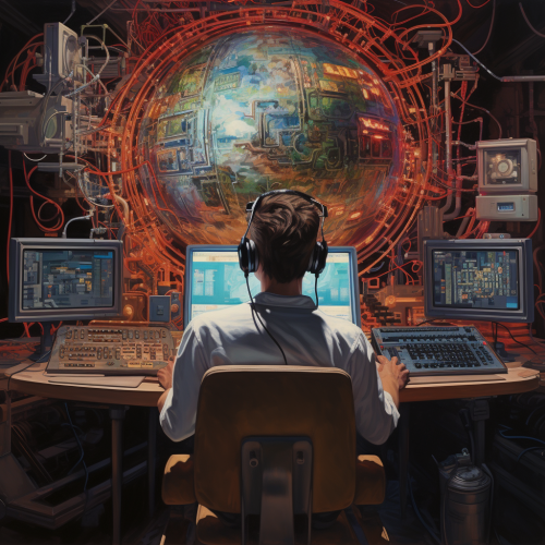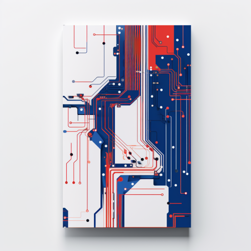 a book cover for a computer repair technician's journey, dynamic and captivating, abstract art style with red, blue, white, and black color scheme, modern and sleek design –ar 2:3