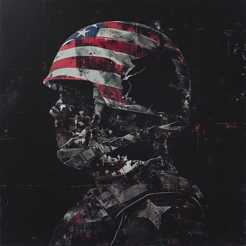 The image is quite dark and abstract, featuring a helmet that appears fragmented or shattered into pieces, with some parts more visible than others. The fragments seem to be superimposed over one another, creating a disjointed and surreal appearance. Within the helmet, there are glimpses of what looks like the American flag, with stars and stripes in red, white, and blue, although these elements are also broken and dispersed across the image. The background is predominantly black, which enhances the dramatic and somewhat eerie effect of the fragmented helmet. The lighting is subdued, with only certain parts of the helmet and flag catching the light, contributing to the overall dark and mysterious mood of the composition. --v 6.0