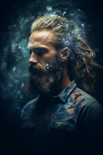 abstract artistic, double exposure of a man with a man-bun and a long messy beard, and the planet earth, Hasselblad H6D, 8k, colour grading, depth of field --ar 2:3
