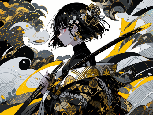 a cartoon woman dressed in a black outfit holding a sword, in the style of go nagai, intricate patterns and details, dark yellow and light white, windows vista, nene thomas, mono-ha, thechamba --ar 4:3 --niji 5