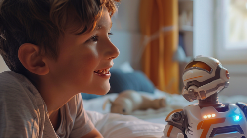 photorealistic image of a child, age 7, in his brightly-lit home, smiling, looking at, and speaking directly to a space war droid action figure. The action figure toy is also speaking directly to the child. In the background is overlay imagery representing a space war-style storyline. Ambiance of the image is one of fun childhood, imaginative play, and positivity. --ar 16:9