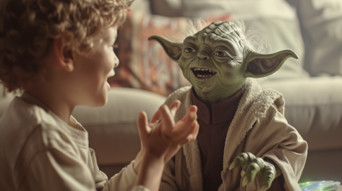 photorealistic image of a child, age 7, in his brightly-lit home, smiling, looking at, and speaking directly to a Star Wars-style action figure toy. The action figure toy is also speaking directly to the child. In the background is overlay imagery representing a star wars-style storyline. Ambiance of the image is one of fun childhood, imaginative play, and positivity. --ar 16:9