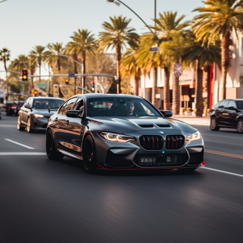 35mm picture of 2023 m3 competition in brooklyn gray color, with red bucket seats, driving down scottsdale road high speed chase police cars following