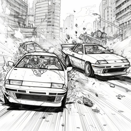 A line art drawing of Cyberpunk car chase by Katsuhiro Otomo, technical manga --niji 5