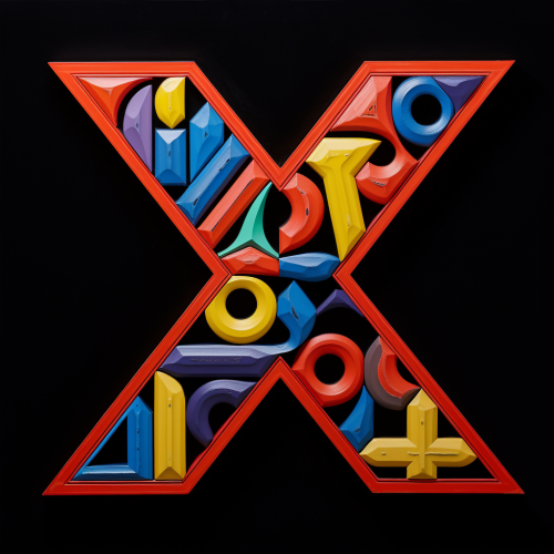 grey alien with yellow eyes building a giant 3 dimensional letter X, purple theme, UFO in background, psychedelic sky and clouds with river, in style of acid trip psychedelic dream art, clean, professional graphic designer