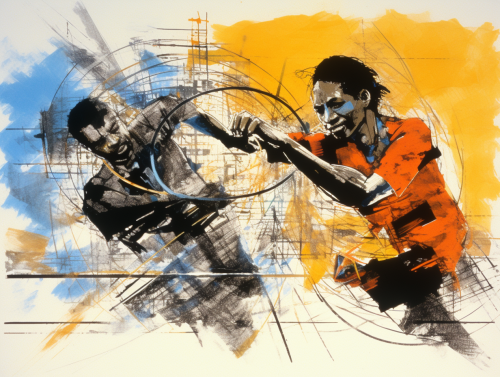 a black and white sketch style newspaper collage style image from 90s, 1992, a white ugly woman in her 43 years old , she wears glasses, she argues with a young man african-american wears glasses who is 18 years old teen. Real emotions but settle, 300dpi, high-res, feels like movie still shot, cinematic , newspaper 1992, collage 1994, film grain, super 16mm film grain, movie film 35mm --ar 16:9